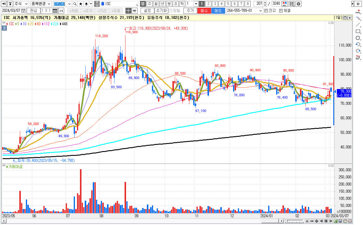 ▶ 23년 5월부터 8월까지 3배가까이 엔비디아를 이유로 상승 하였습니다. ISC는 반도체 테스트를 위한 소모품인 소켓 생산 업체입니다. 현재 엔비디아에 소켓을 납품 중입니다.엔비디아의 제품 수요가 늘어날 것이라는 전망에 수혜주로 분류되었습니다.